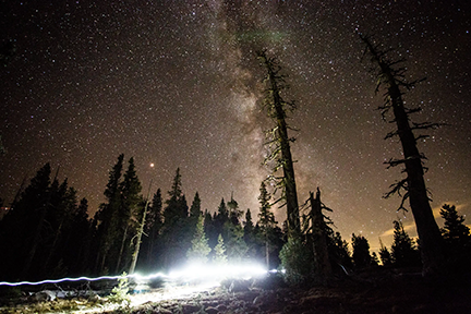 I’ve stared at Courtney’s photo for long enough that it now has the essential qualities of a fairy tale: a woman alone against the menacing earth and mystical sky. The light of her headlamp is a steady line at first and then the line expands as if the woman herself is radiant, as if she’s reaching a new level of consciousness or shooting into another dimension. Two little aftershocks of light hit the trees as she disappears behind them.